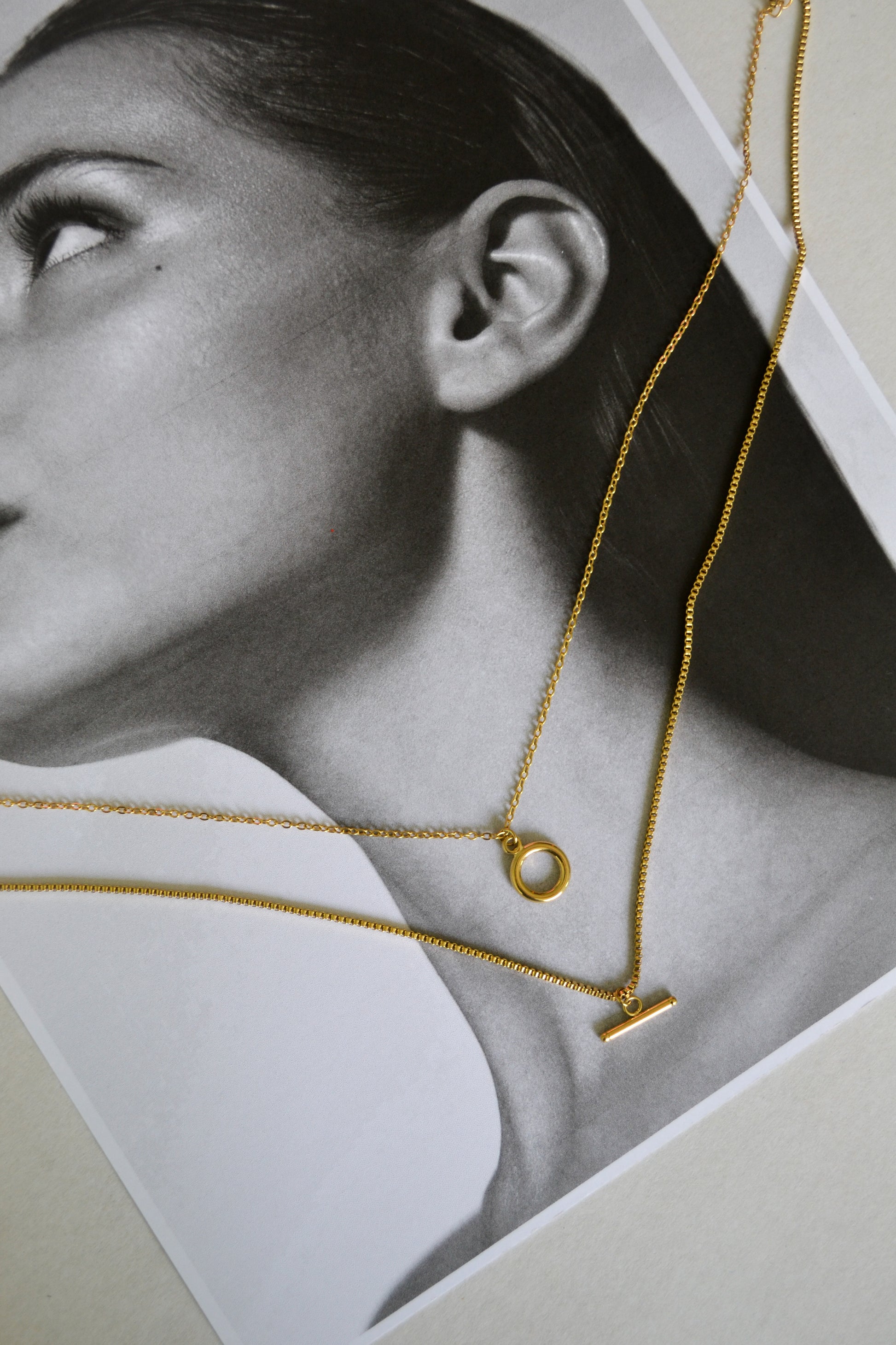 Dos cadenas que se unen en un balance perfecto de líneas y formas. El contraste entre el aro pulido y la barra minimalista crea una pieza de carácter sereno y atemporal. Ideal para elevar cualquier look con un toque de elegancia contenida.
